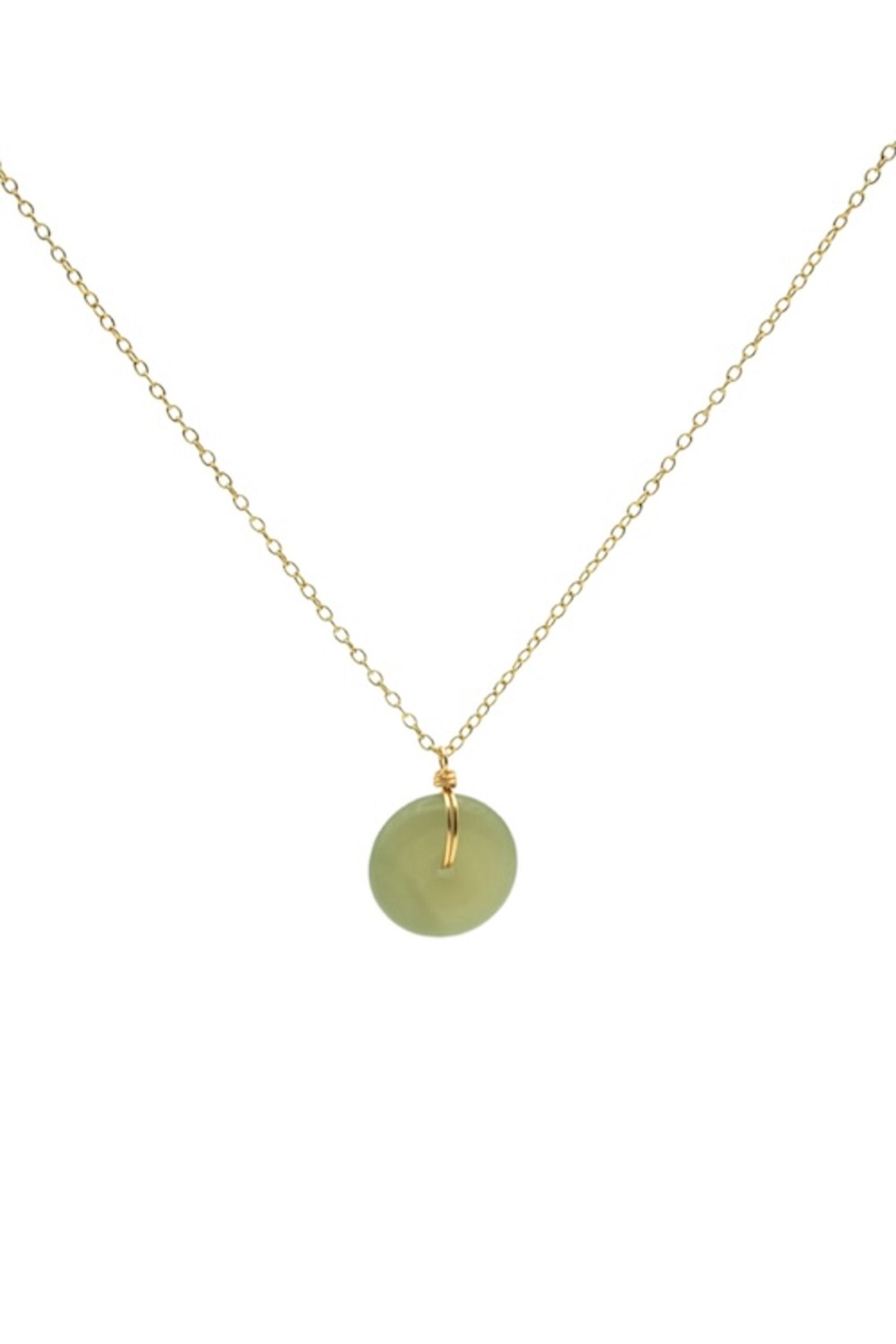 The Coin necklace features a hollow round pendant in green lab nephrite and an adjustable chain in 14k gold-plated sterling silver.