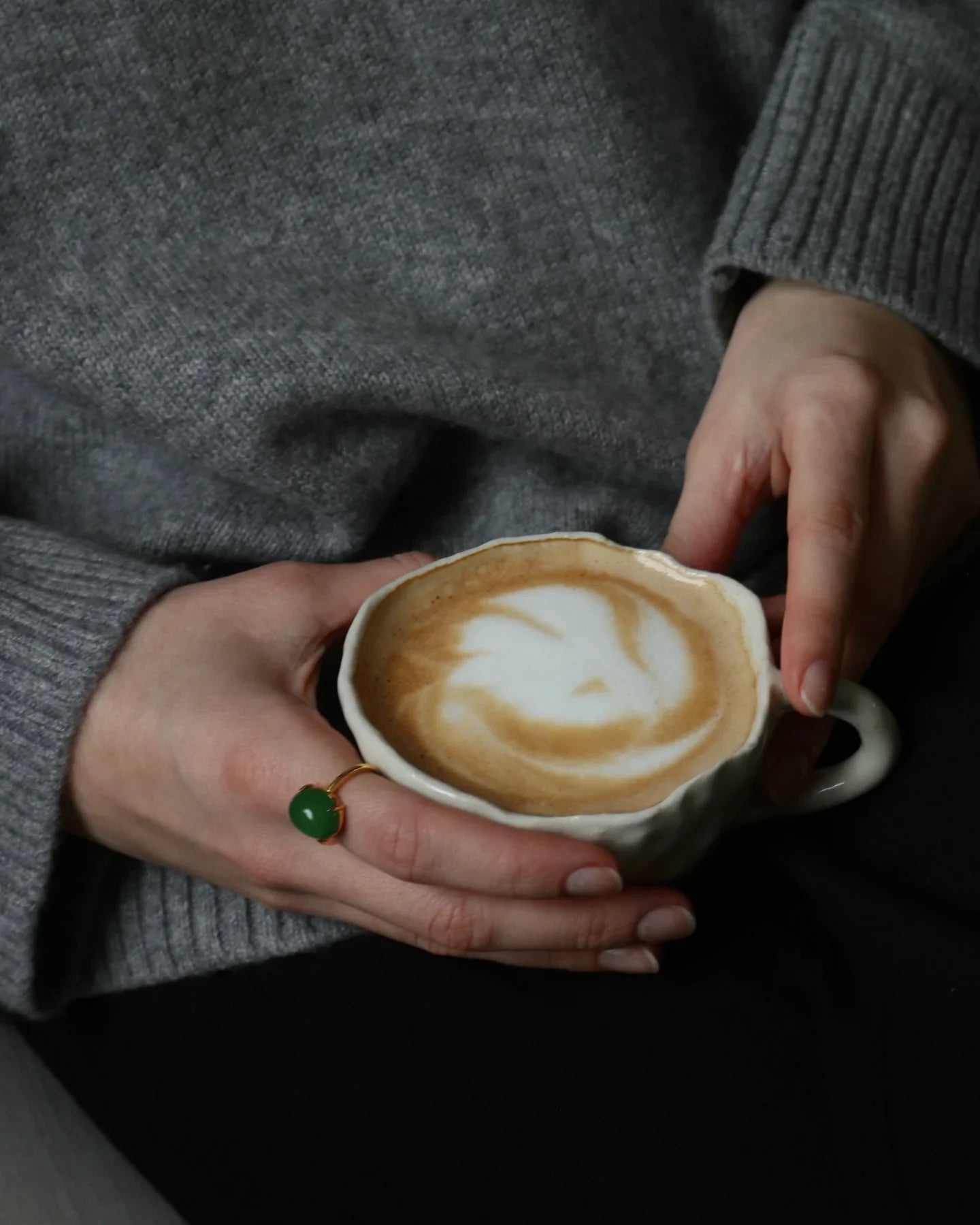 This Dew ring is a stunning combination of modern and classic design. The gold-plated skinny ring band is delicately set with an oval-shaped green chalcedony centerpiece, creating an elegant, timeless style. Named after “dew” due to its shape, this ring is a luxurious addition to your collection.
