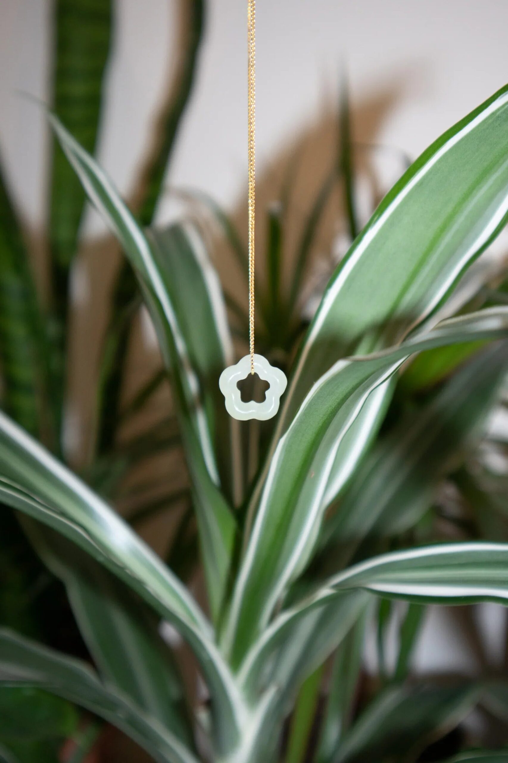 Feel like a flower in bloom when you wear this gorgeous Plum blossom necklace. It features a unique flower shape made of green nephrite jade, perfect for adding a little freshness to your everyday looks.